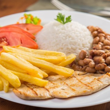 Acompanha: Arroz, feijão, frango grelhado, batata frita e salada