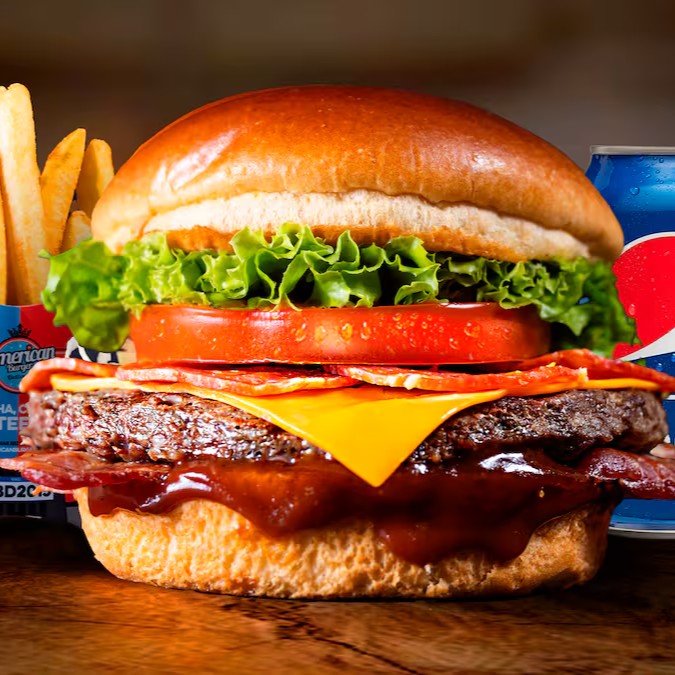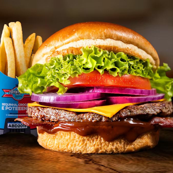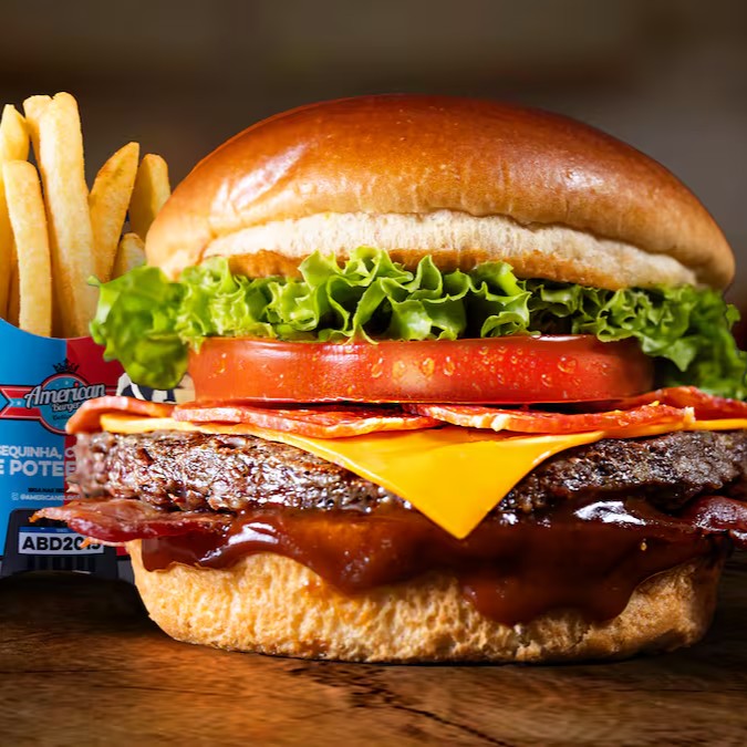 Um pão brioche macio e levemente tostado abraça um hambúrguer bovino suculento de 120g, grelhado na medida certa. O irresistível Molho American se mistura ao queijo cheddar derretido, às fatias crocantes de bacon e ao toque fresco da cebola roxa, alface americana e tomate maduro. Para completar essa explosão de sabores, uma porção generosa de batatas fritas douradinhas e uma bebida bem gelada. Uma refeição perfeita para satisfazer todos os seus sentidos!