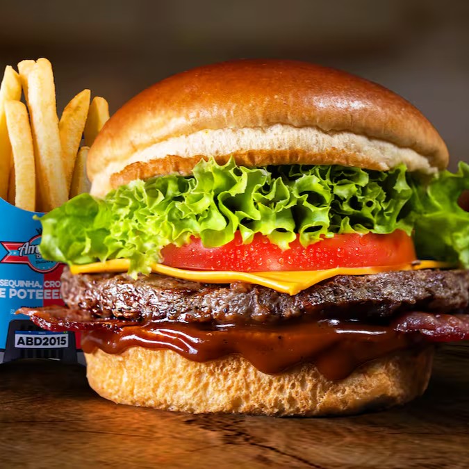 Um pão brioche macio e levemente tostado envolve um hambúrguer bovino suculento de 120g, realçado pelo irresistível Molho American. O sabor fica ainda mais completo com bacon crocante, queijo cheddar derretido e o frescor do alface americano e tomate. O toque especial do alho-poró traz uma camada de sabor única e sofisticada. Acompanha uma porção generosa de batatas fritas douradinhas e uma bebida bem gelada para completar essa experiência saborosa. Cada mordida é um convite ao prazer!