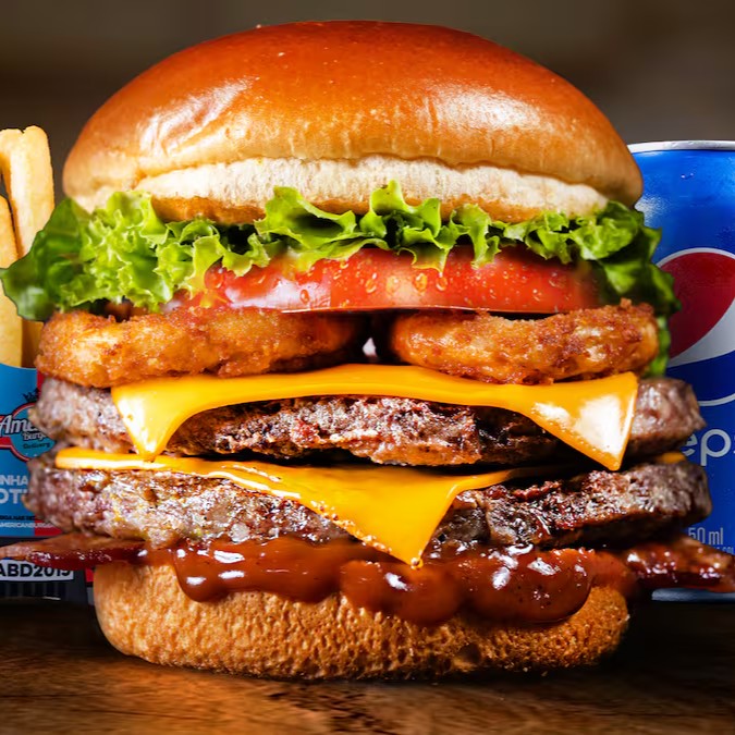 Pão Brioche, hambúrguer bovino 120g, hambúrguer aroma picanha 120g, molho american, double bacon, double cheddar, onion rings, tomate, alface americana e acompanha fritas. (Bebida Opcional)