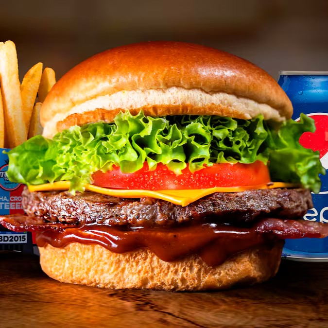 Uma explosão de sabores em cada mordida! Um pão brioche macio envolve um hambúrguer bovino suculento de 120g, perfeitamente grelhado. O Molho American e o queijo cheddar derretido se combinam em uma cremosidade irresistível, enquanto o bacon crocante e a cebola crispy adicionam textura e sabor defumado. O toque adocicado e levemente picante do molho sweet chilli harmoniza com a frescura do alface americano e do tomate. E, para completar essa delícia, acompanha uma porção generosa de batatas fritas douradinhas e uma bebida bem gelada. É o combo perfeito para quem busca sabor e textura em cada detalhe!