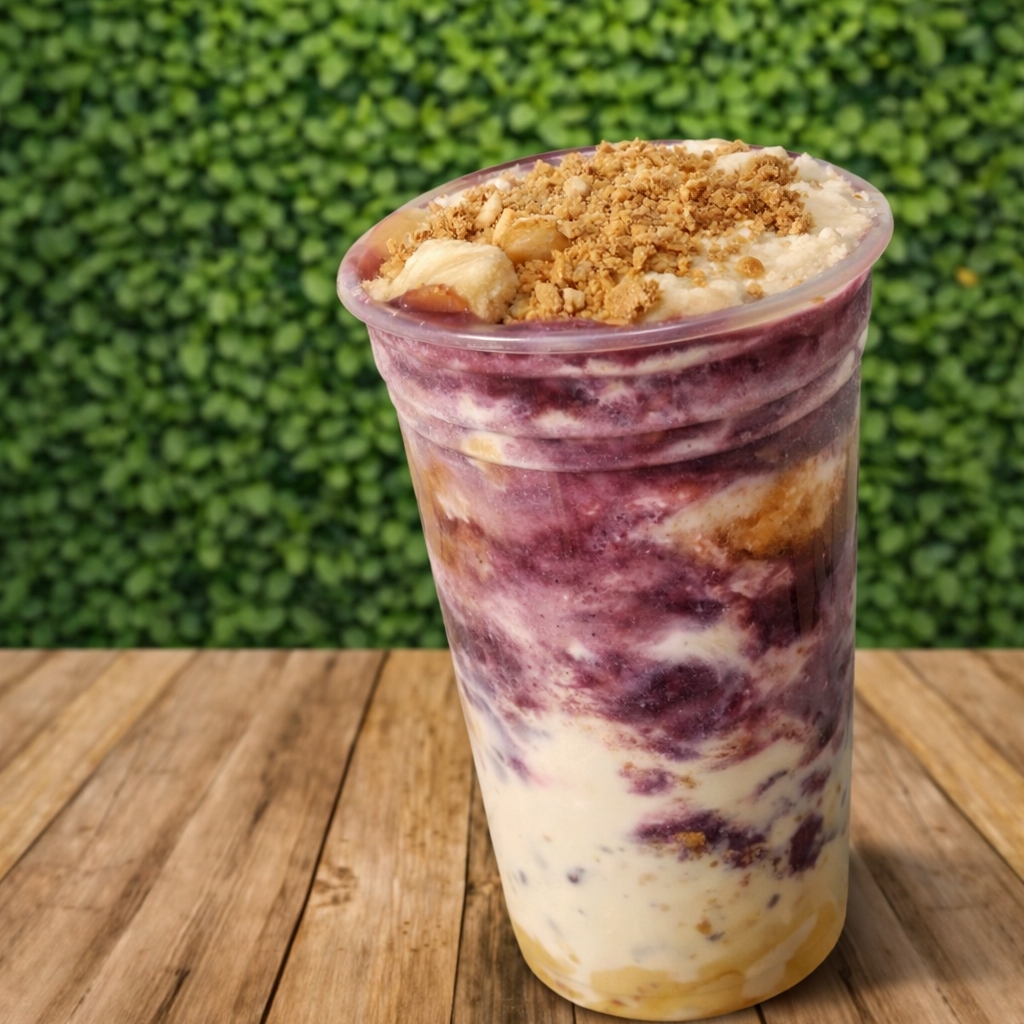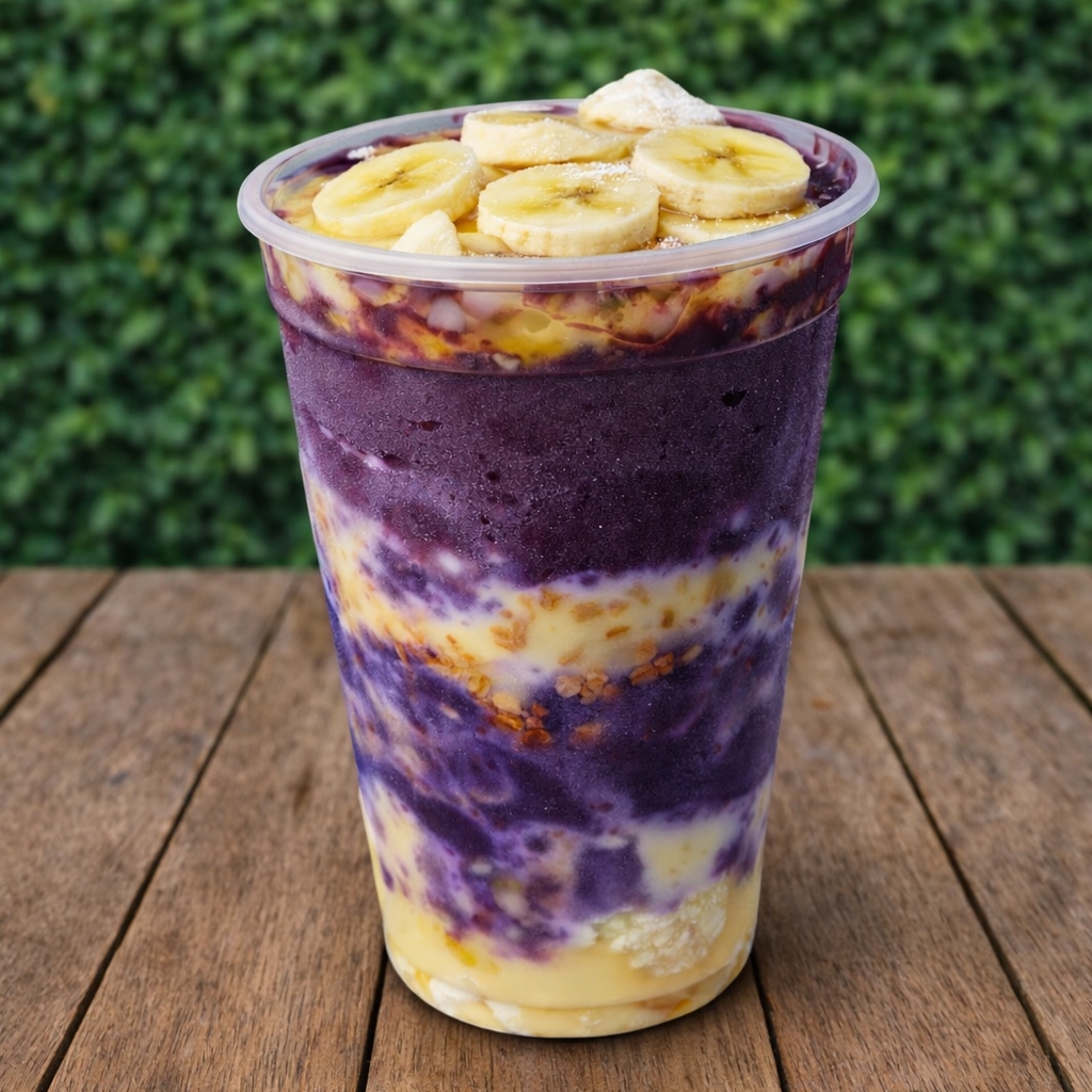 Creme de Açaí, Paçoca Triturada, Banana em Rodelas, Chantinho, Leite em pó, Leite condensado.