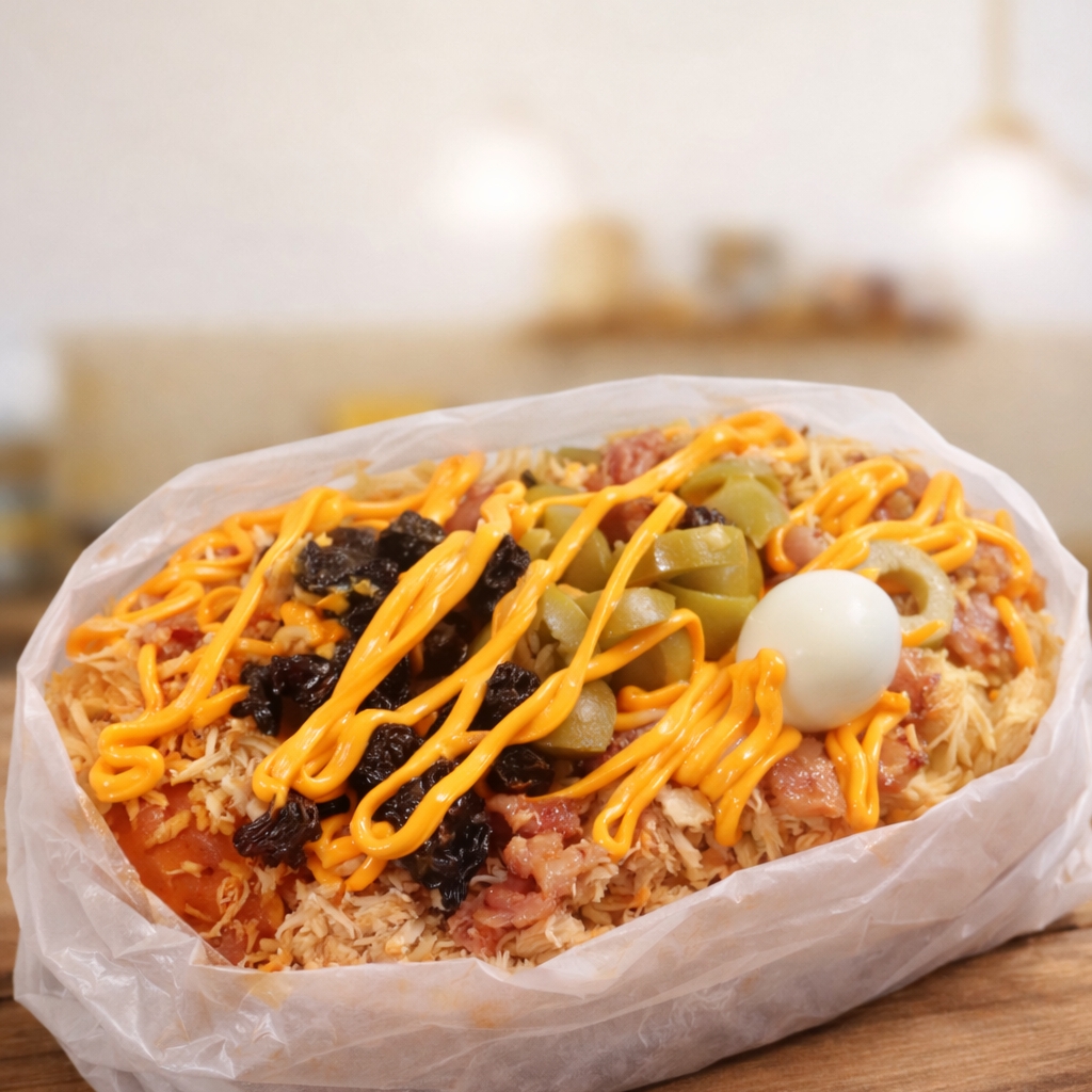 Pão, 3 salsicha, presunto, mussarela, frango desfiado, bacon, cheddar, batata palha, azeitona, 2 ovo de codorna, uva passas e milho