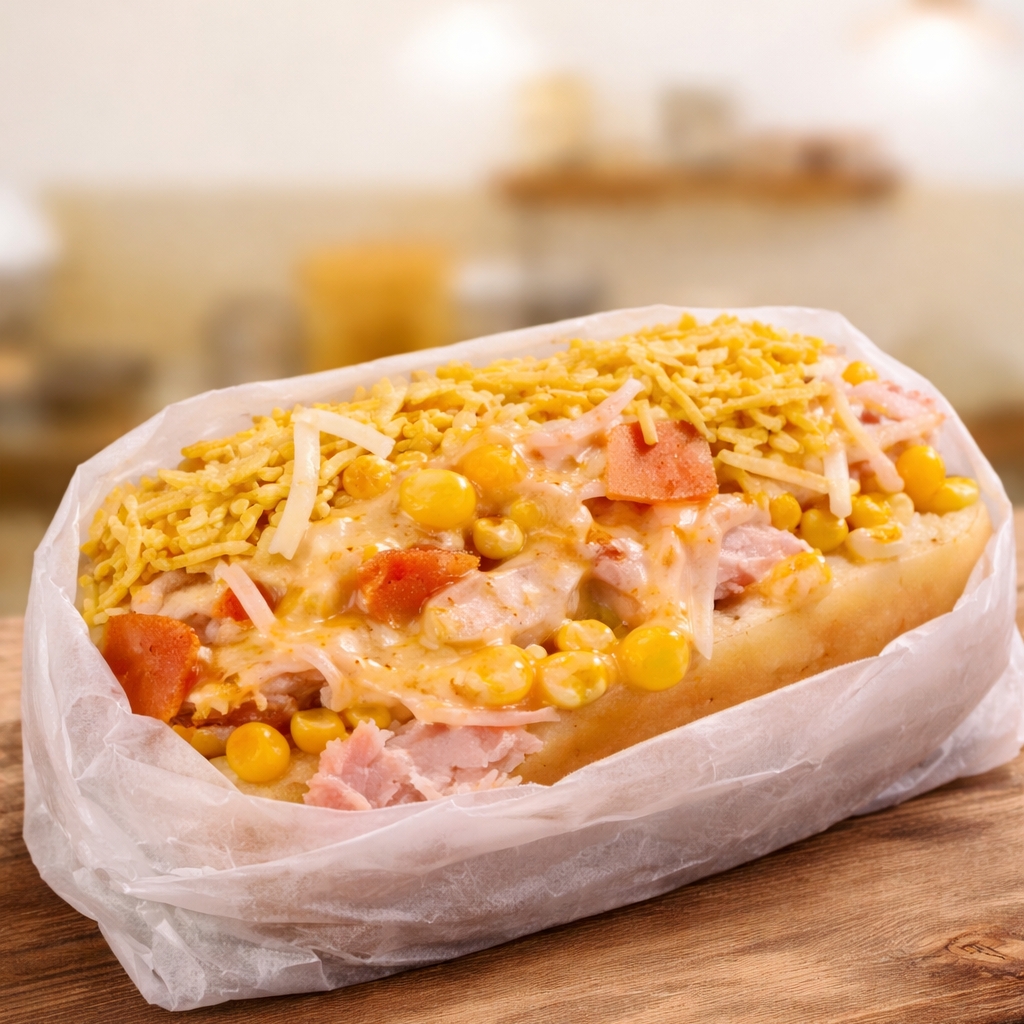 Pão, molho, salsicha, presunto, mussarela, batata e milho