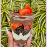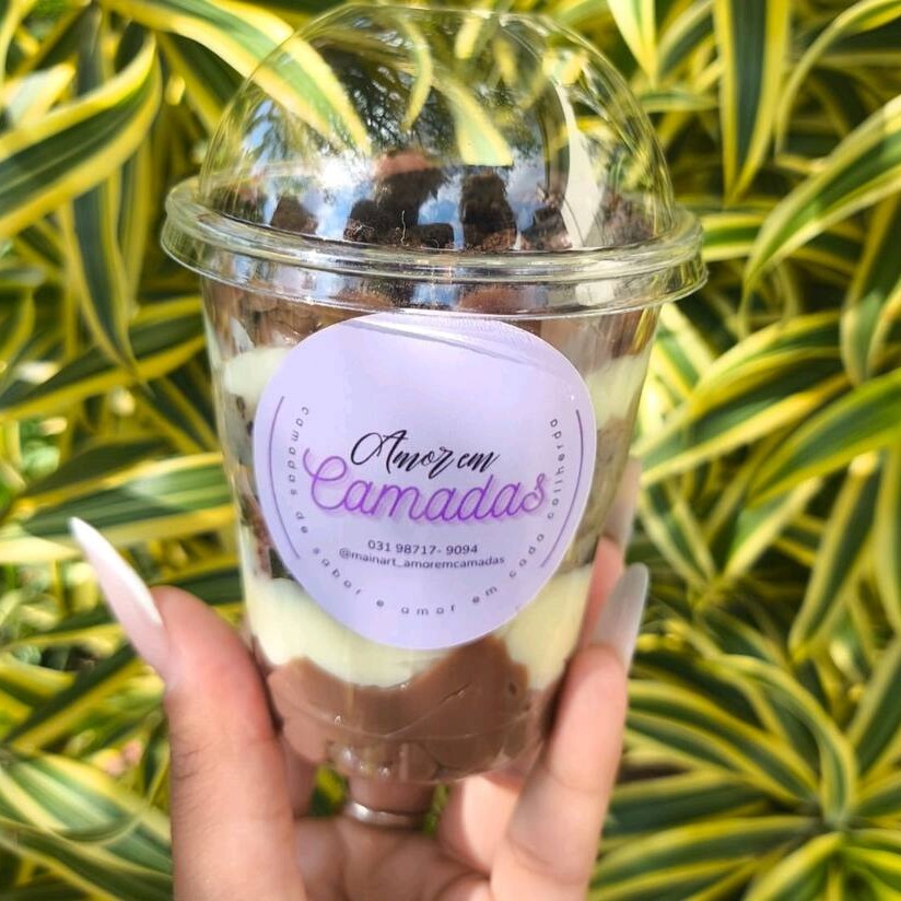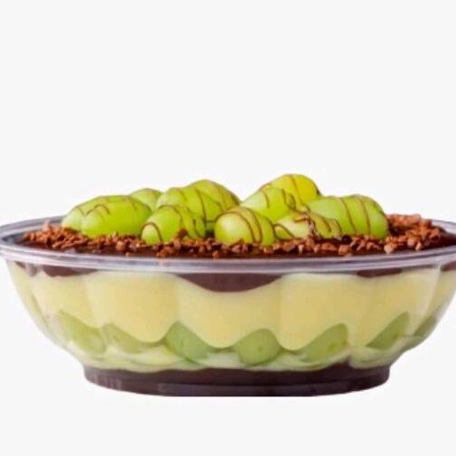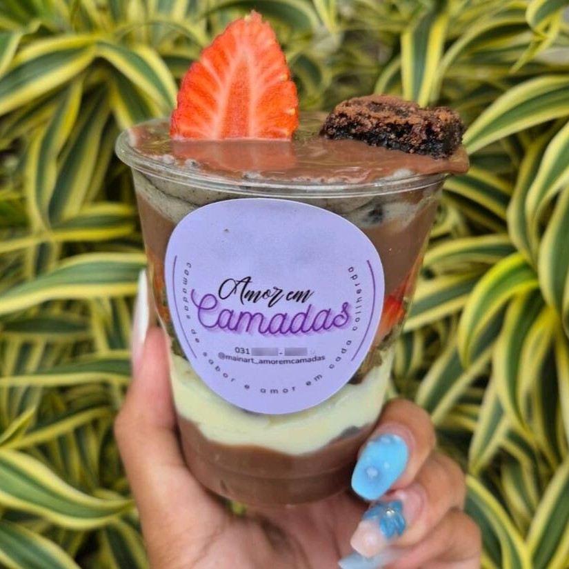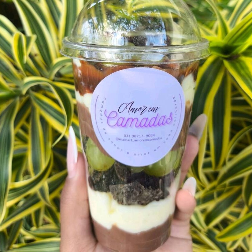 Camadas de creme branco cremoso, brownie artesanal, creme de chocolate , Nutella e uvas frescas que trazem um toque leve e frutado.
