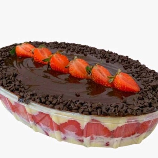 - brigadeiro branco cremoso , morangos frescos brigadeiro preto chocolatudo, finalizado com granulado ao leite e morangos decorados