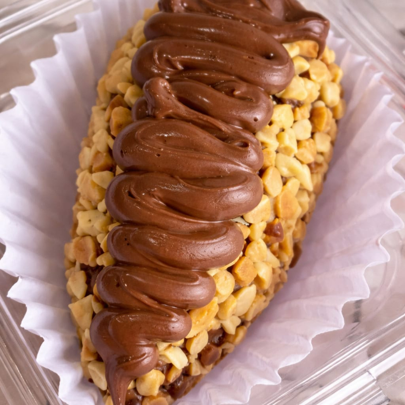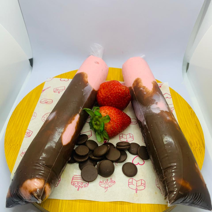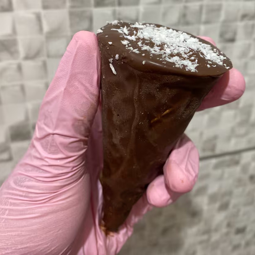 Casquinha banhado no chocolate e recheada com recheio de Prestígio.