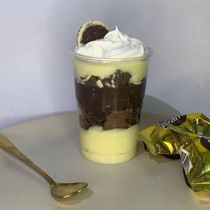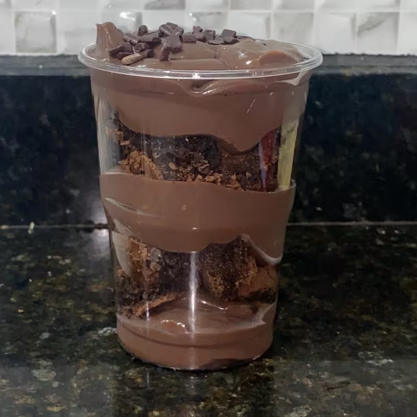 Uma cama de de brigadeiro cremoso com pedacinho de brownie 50% esse copo é uma maravilha