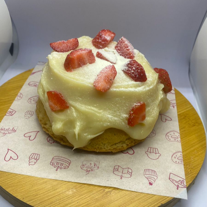 mini bolo caseiro de massa branca, com pedaços de morango no centro, finalizado com creme de ninho e pedaços de morangome de niho