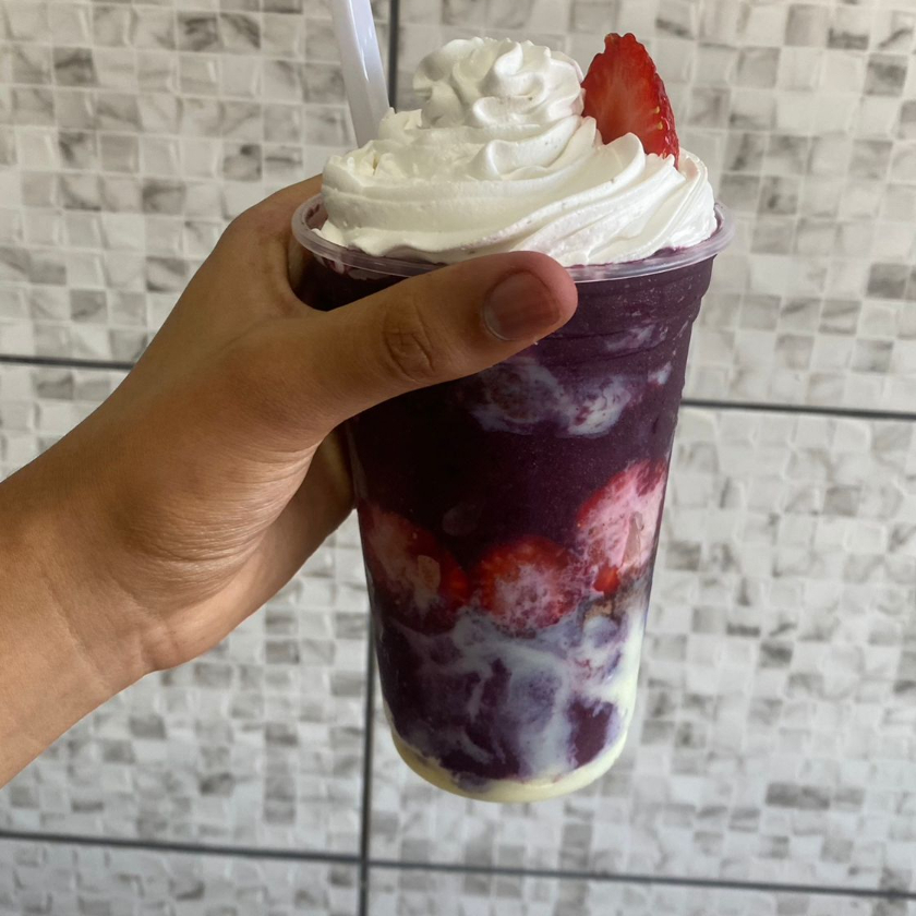 Açaí com camada de leite em pó e leite condensado e 1 fruta e 2 acompanhamentos a sua escolha.