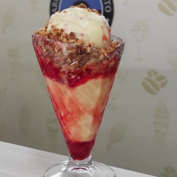1 Bola de sorvete, cobertura de sorvete, farofa especial e creme de chantilly. Tamanho : Como 400 ml