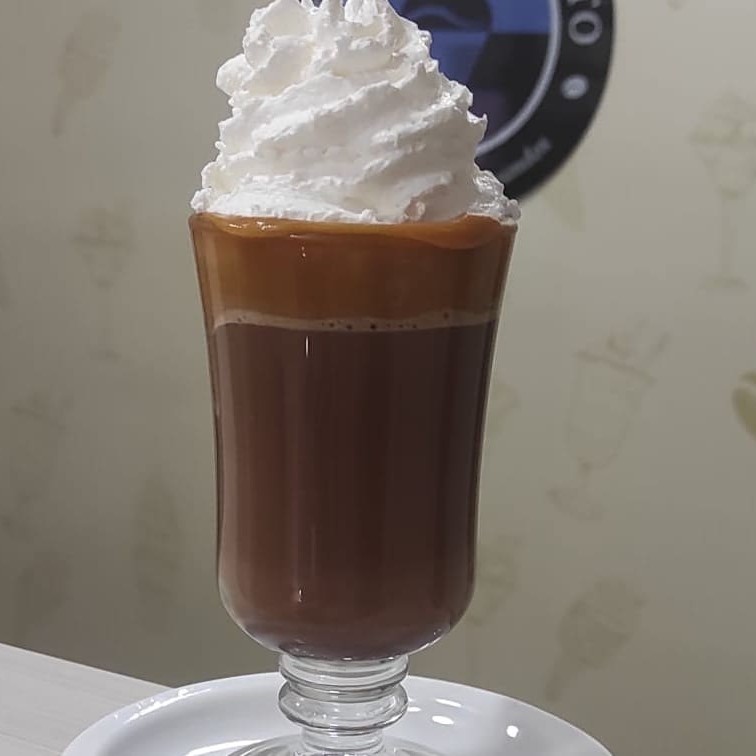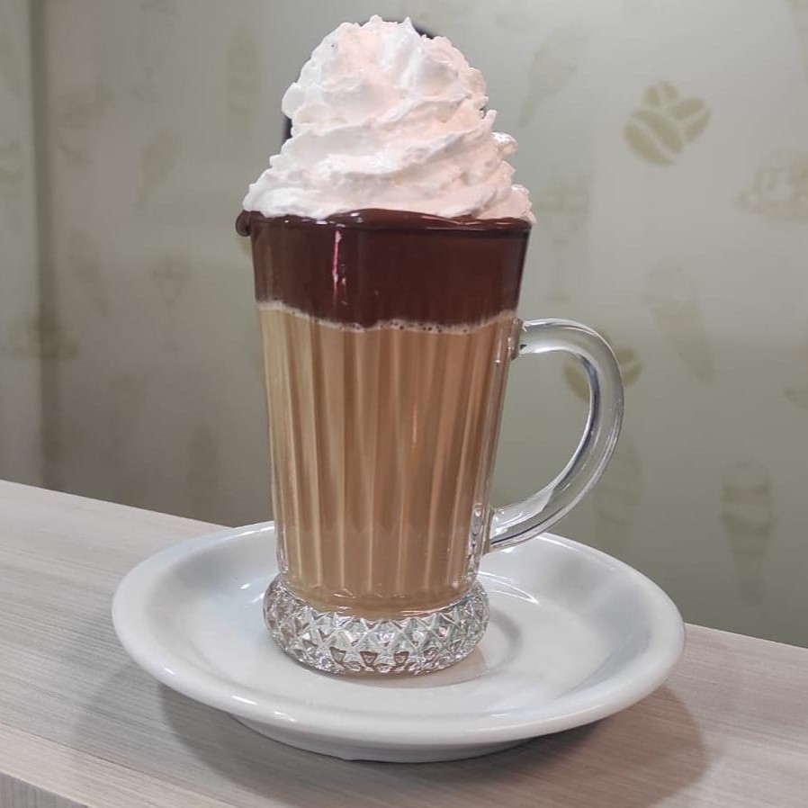 Café expresso gelado, sorvete de baunilha, leite em pó, calda de chocolate belga e creme de chantilly. Obs: Enviado no copo de 240 ml e o chantilly em embalagem separada.
