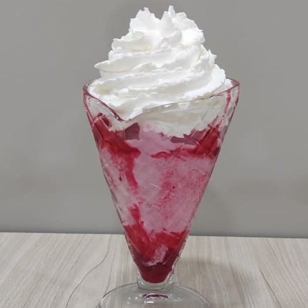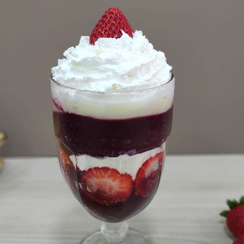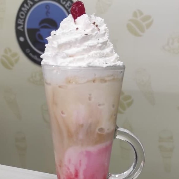 Café expresso gelado, sorvete de baunilha, sorvete de morango, pedaços de cereja e creme de chantilly. Obs: Enviado no copo de 240 ml e o chantilly em embalagem separada.