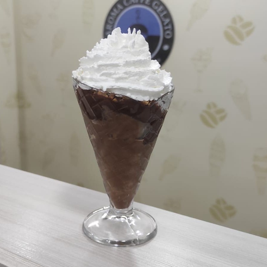 Chocolate cremoso gelado, sorvete de baunilha, calda de caramelo e creme de chantilly. Obs: Enviado no copo de 240 ml e o chantilly em embalagem separada.