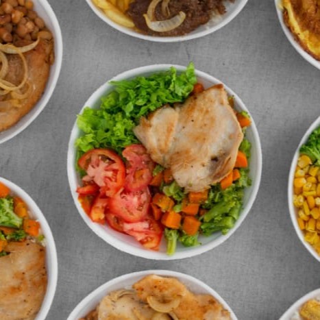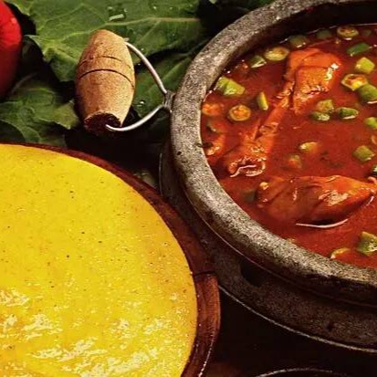 Arroz Branco, Feijão Comum, Angu, Frango com Quiabo e Salada