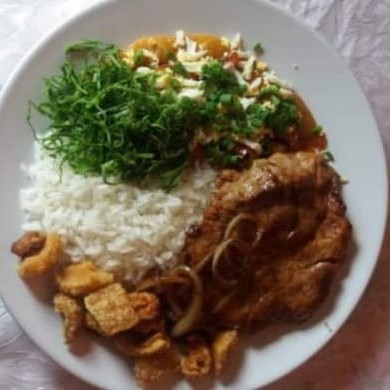 Arroz Branco, Tutu de Feijão, Bife de Pernil, Couve, Torresmo e Salada à Parte