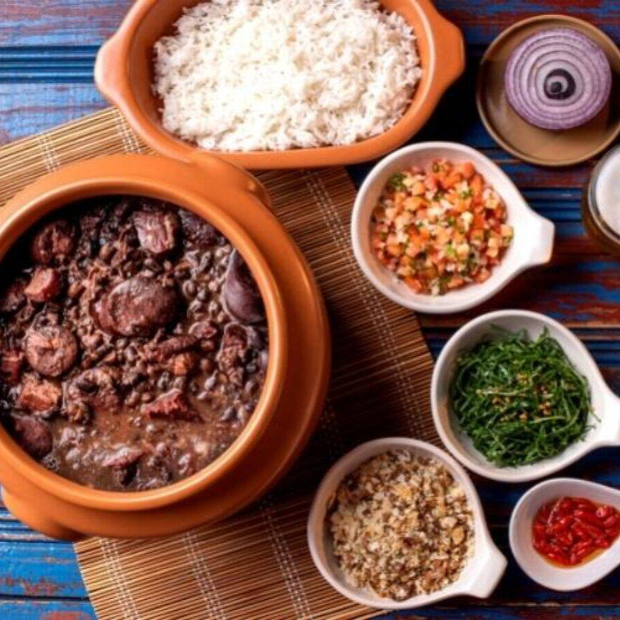 Feijoada Magra com Bacon, Linguiça e Costelinha. Acompanha Couve, Laranja e Farofa
