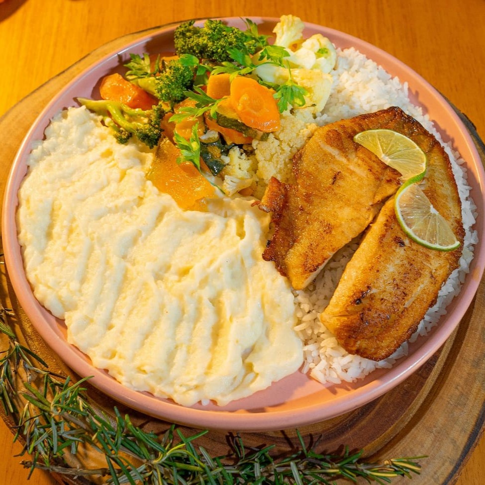 Arroz, tilápia empanada, purê e legumes salteados na manteiga