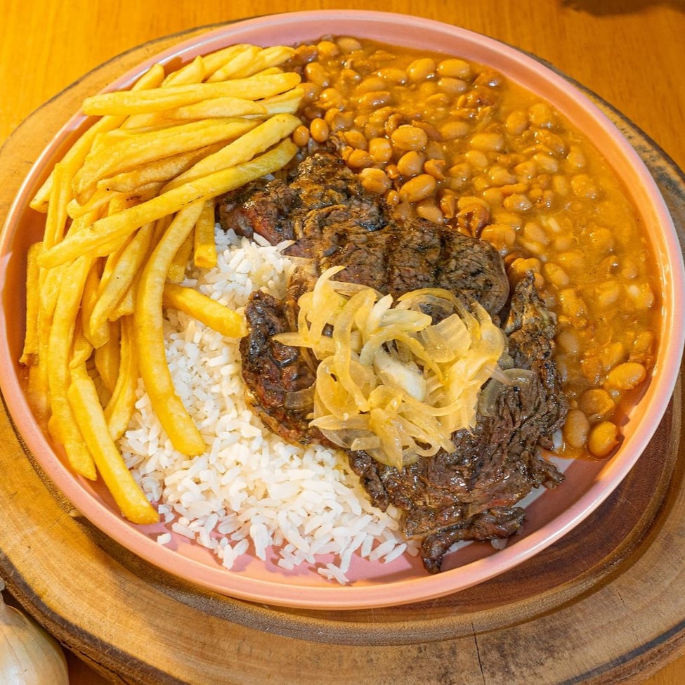 Bife bovino acebolado, arroz, feijão, fritas e salada