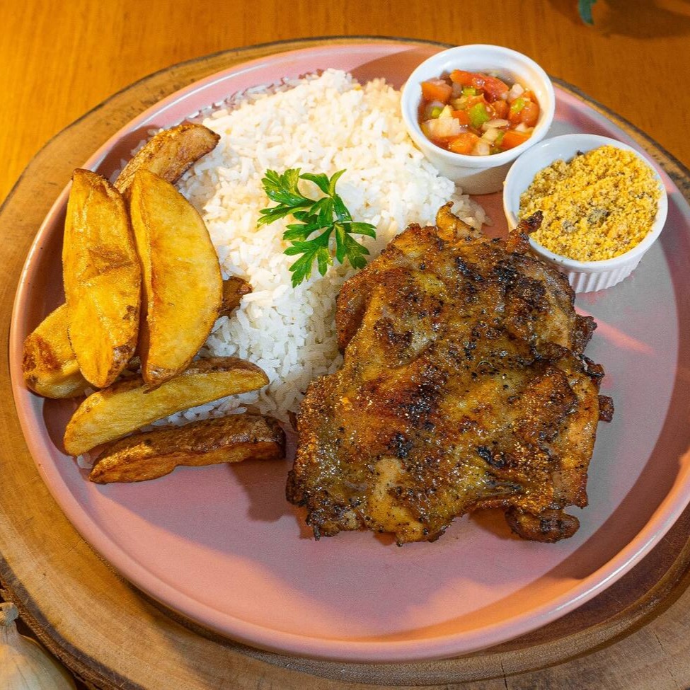 Sobrecoxa desossada, arroz branco, batata rústica ou legumes salteados, farofa e vinagrete