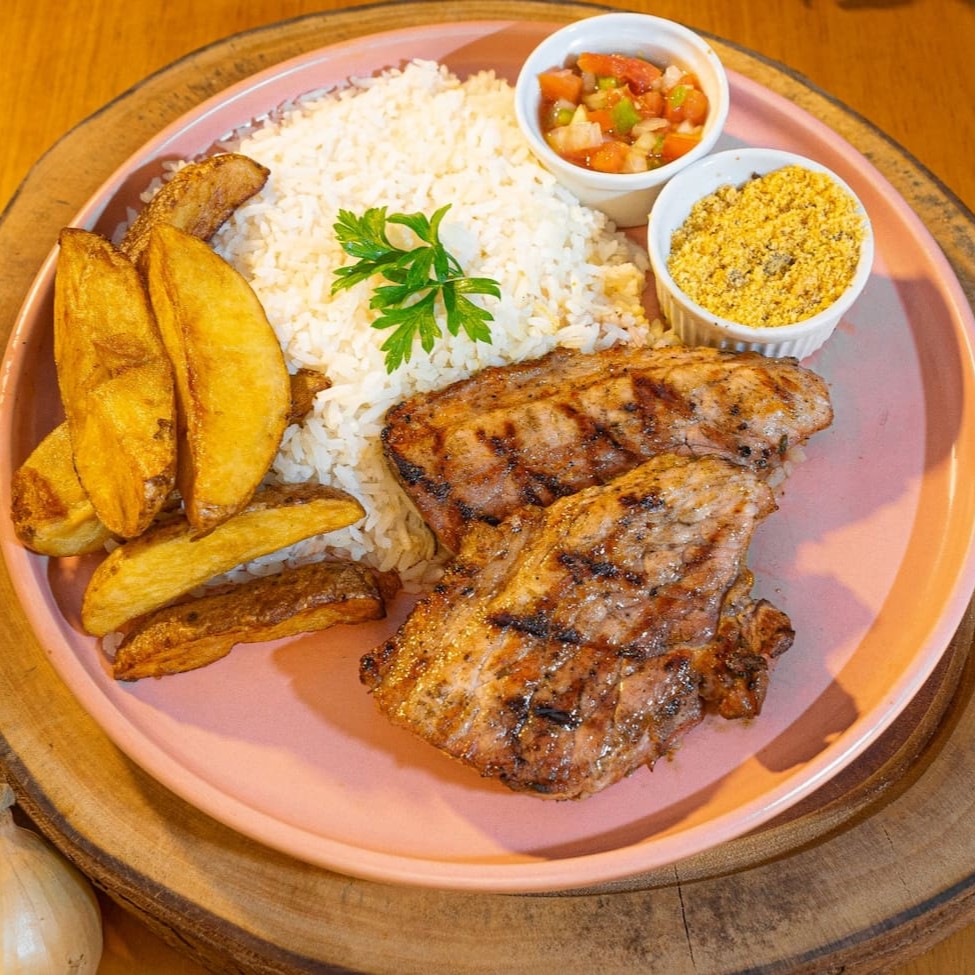 Picanha suína, arroz branco, batata rústica ou legumes salteados, farofa e vinagrete