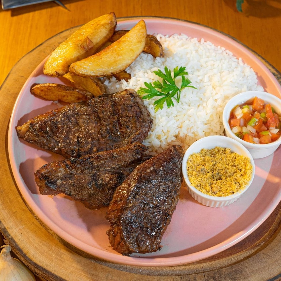 Ancho bovino, arroz branco, batata rústica ou legumes salteados, farofa e vinagrete