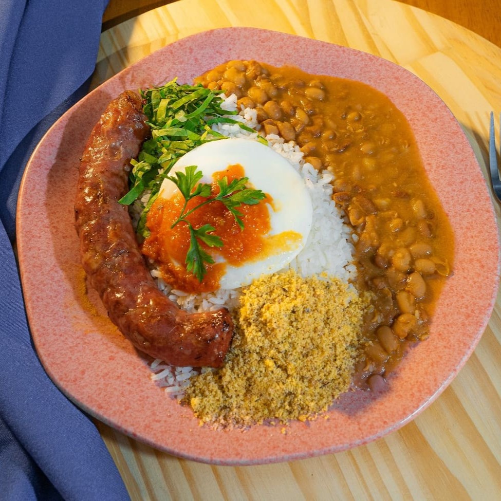 Arroz, Feijão, Farofa, Ovo Frito, Linguiça, ou Filé de Frango, ou Sobrecoxa Desossada e couve