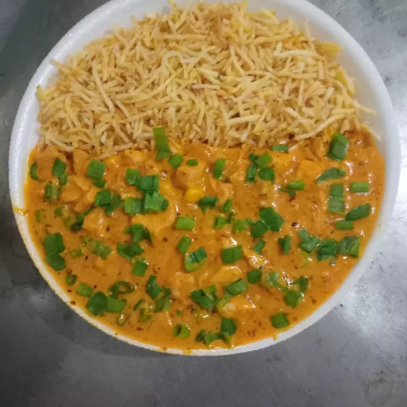 Estrogonofe de frango arroz e batata palha crocante opção pote de salada gratis uma sobremesa