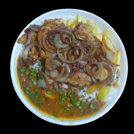arroz ,feijao, bife de boi acebolado,fritas crocrante