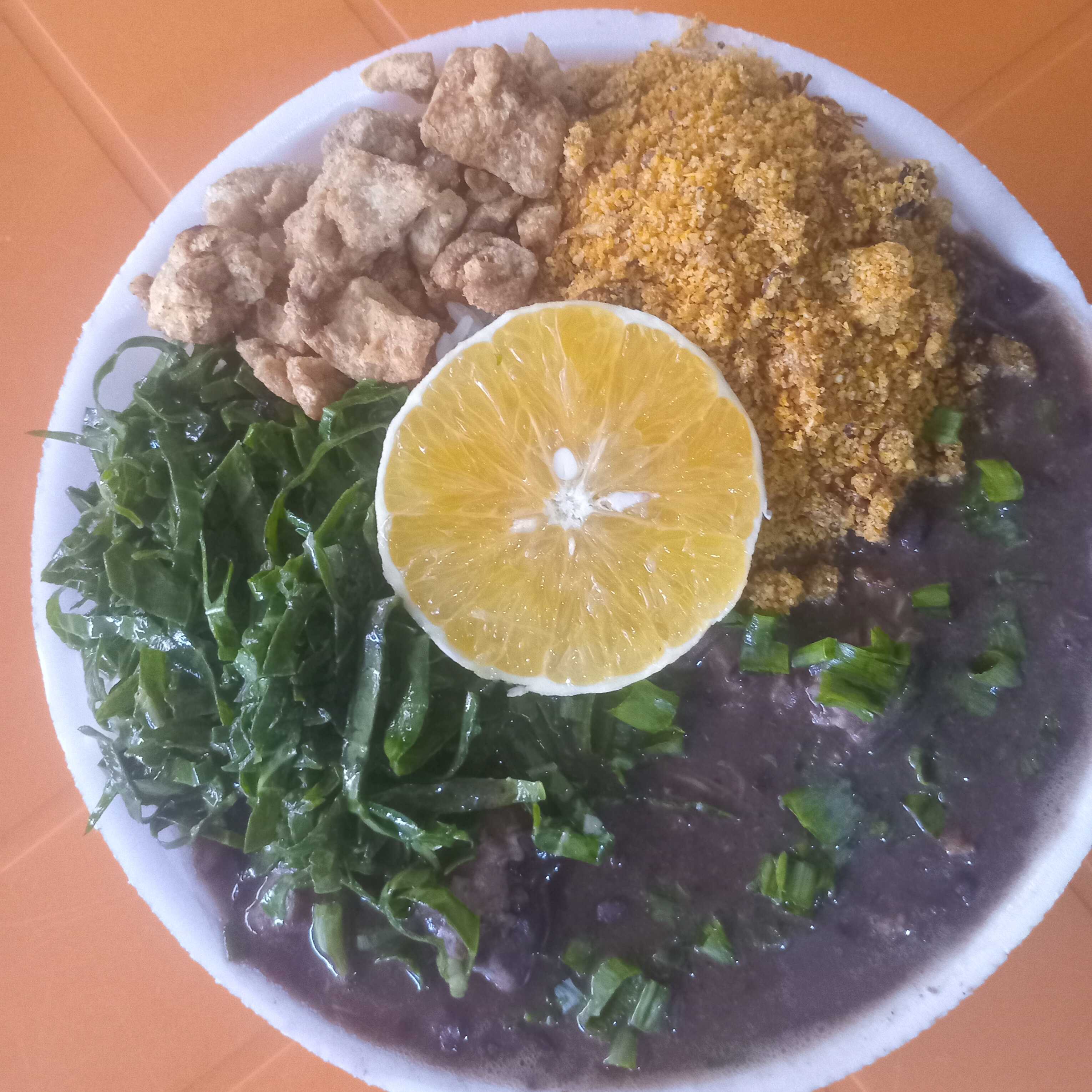 arroz ao alho,feijoada caseira tempero da roça,torresmo crocrante,fatia de laranja,couve refogado,farofa caseira,pote de vinagrete