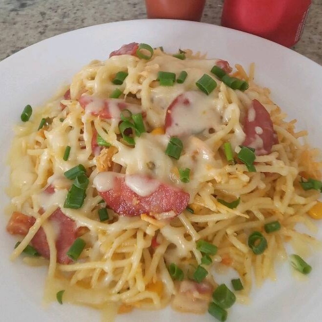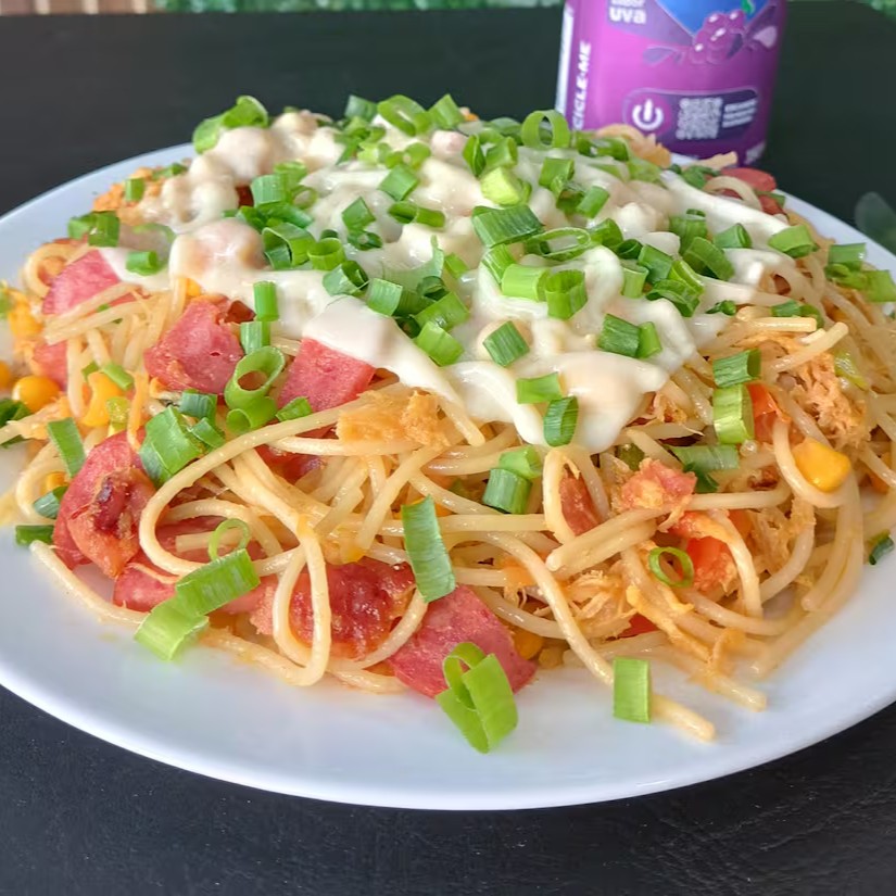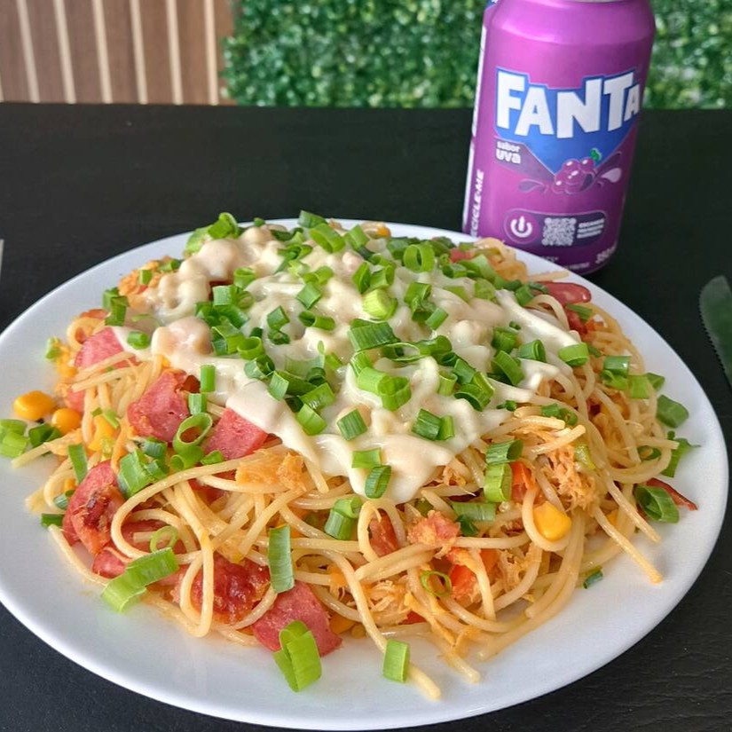 Macarrão com calabresa, bacon, frango desfiado, milho, vinagrete, muçarela e cebolinha.