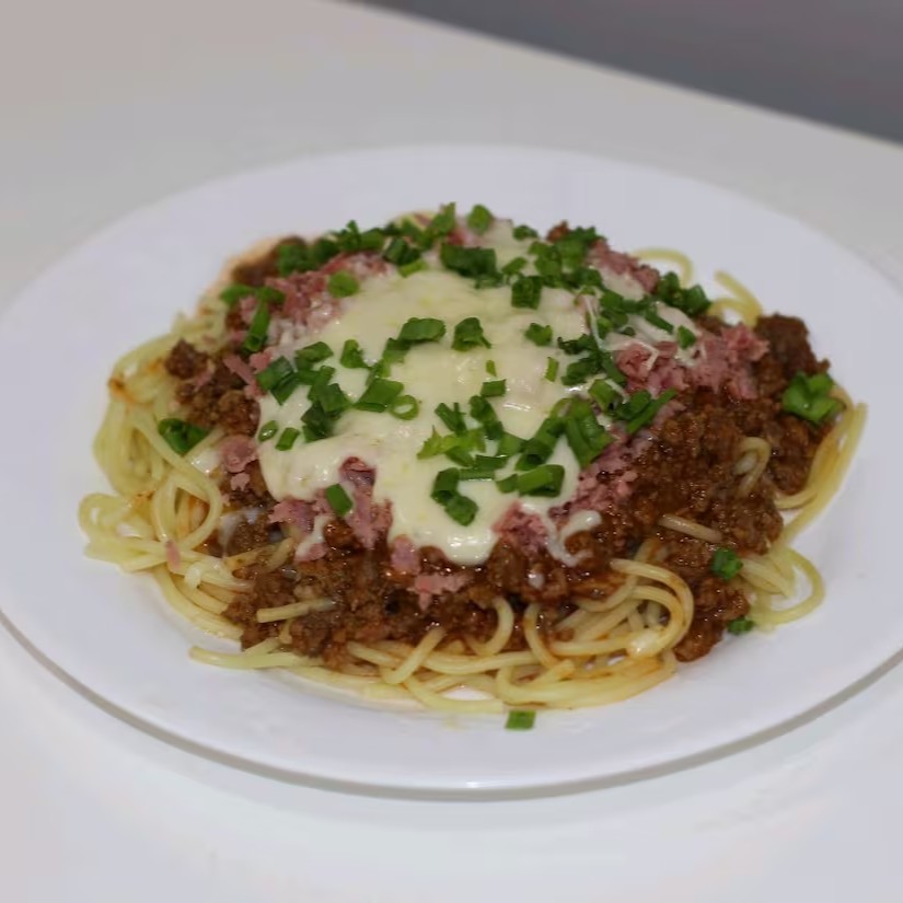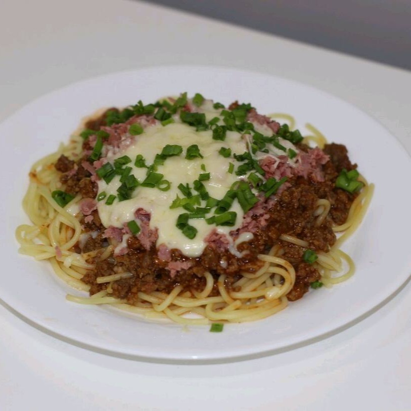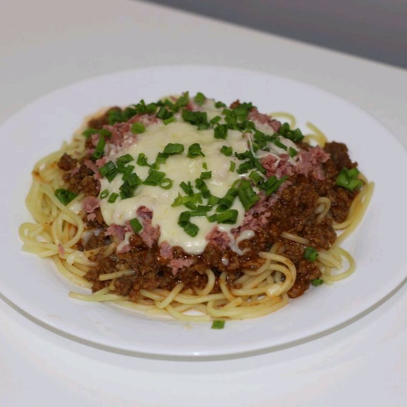 molho a bolonhesa,milho,mussarela e cebolinha.