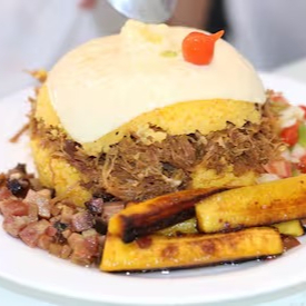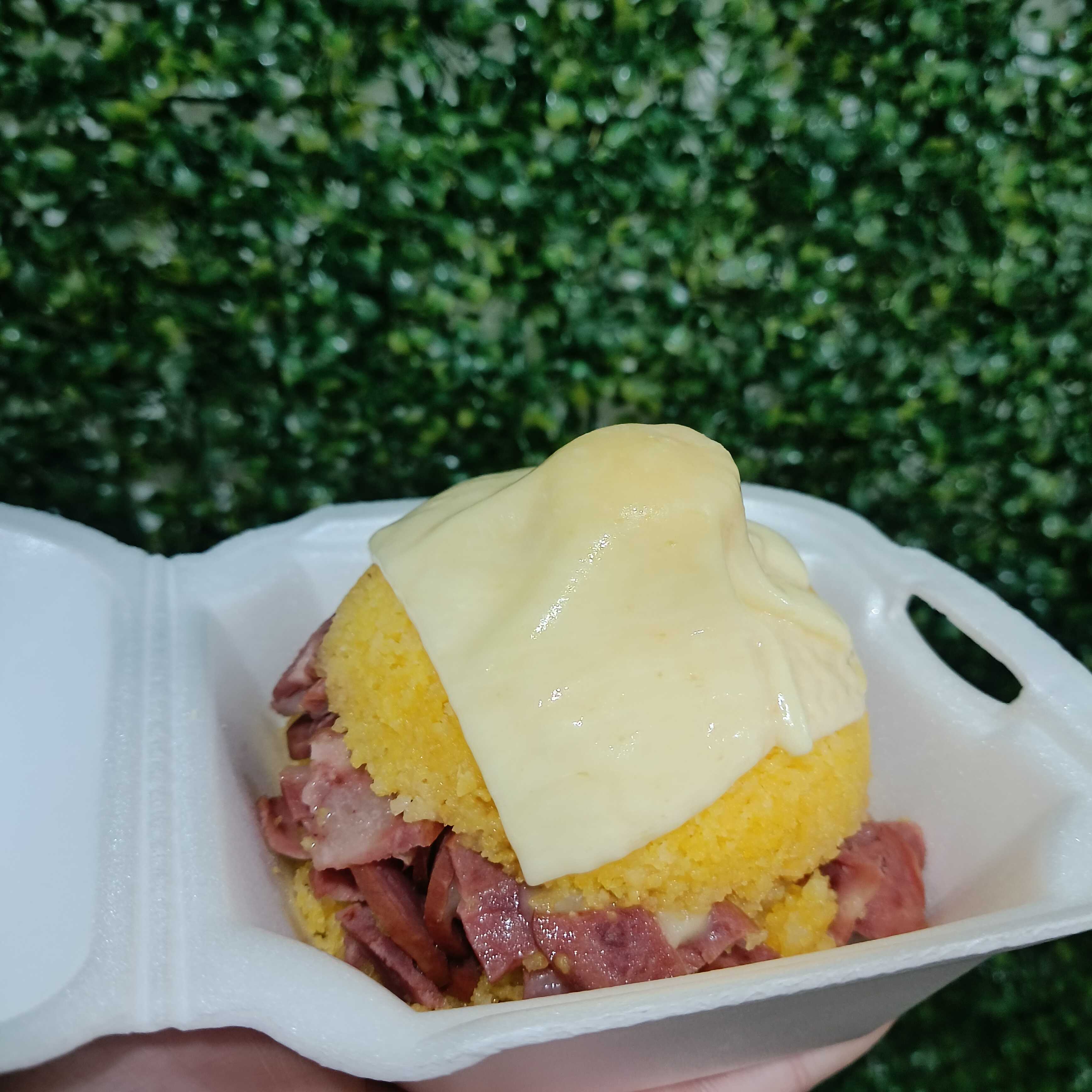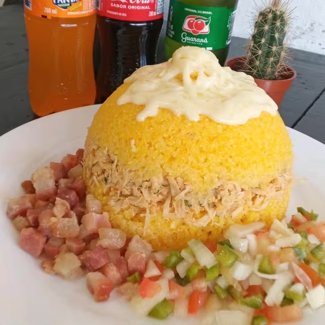 Cuzcuz de carne seca com, Bacon, mussarela, Catupiry e vinagrete.