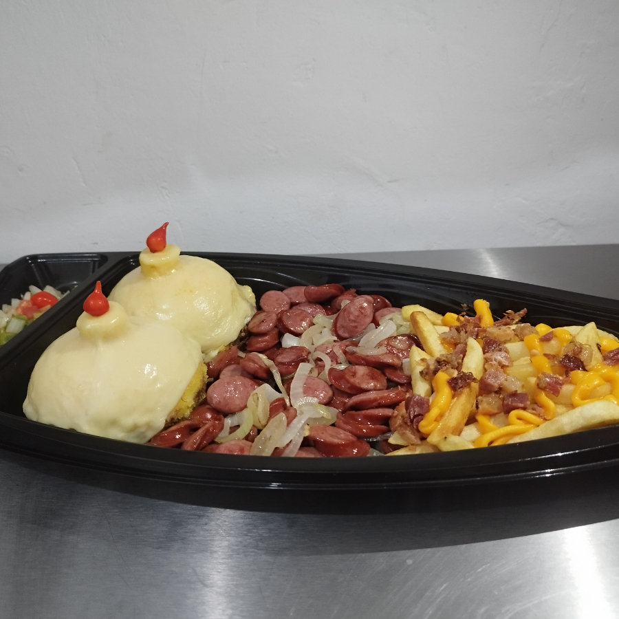 Essa deliciosa barca é composta por 2 cuscuz recheado de carne seca com Catupiry e de acompanhamento vai 300gm de contra filé acebolado, 400gm de batata frita com cheddar ,bacon, muçarela e vinagrete .