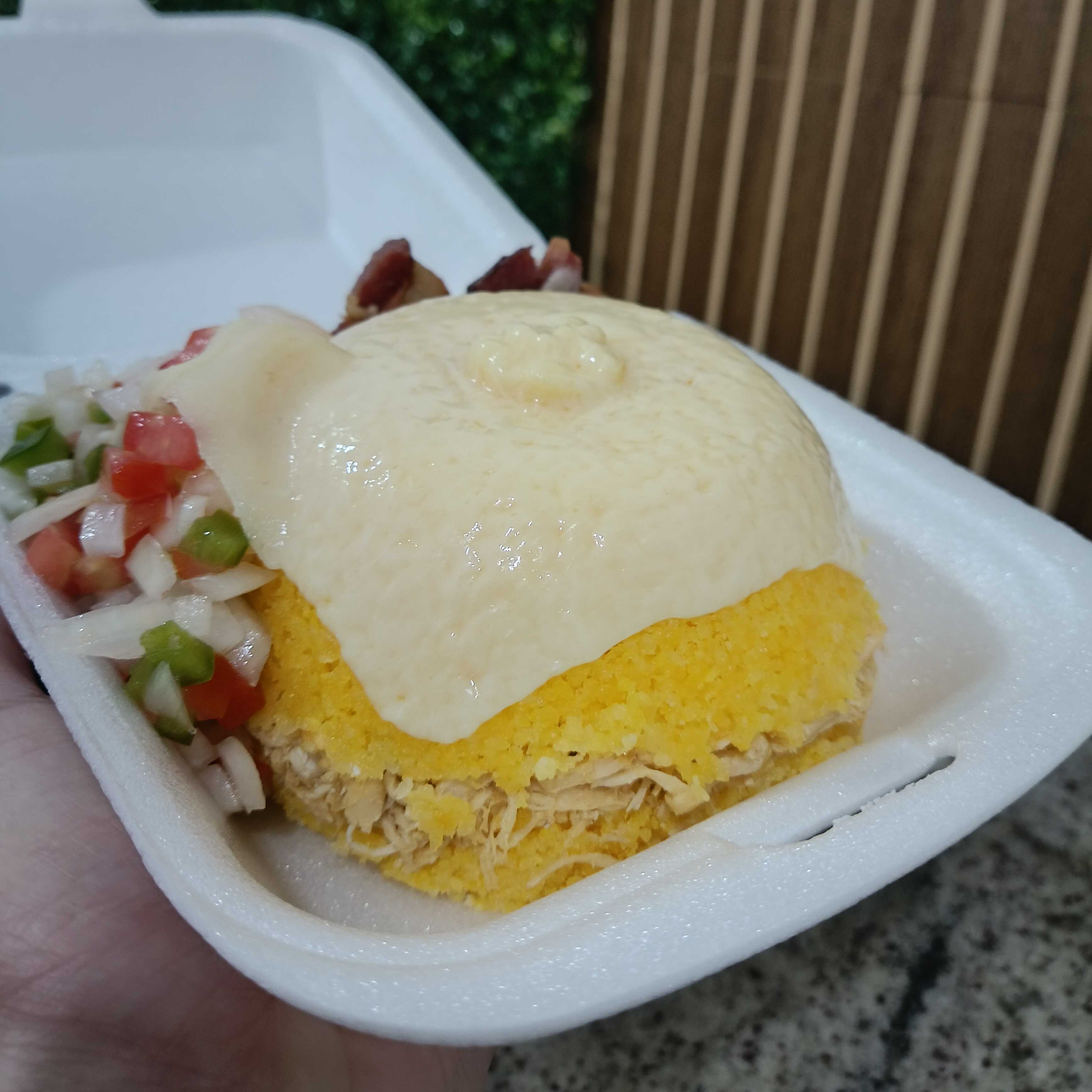 frango desfiado com bacon, mussarela, Catupiry e vinagrete.