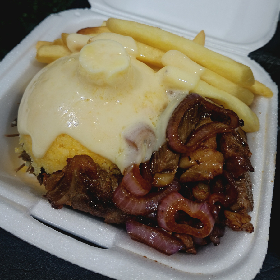 Cuscuz com carne seca, muçarela, 150g de batata frita, 150 gramas de contra filé acebolado.