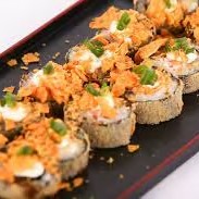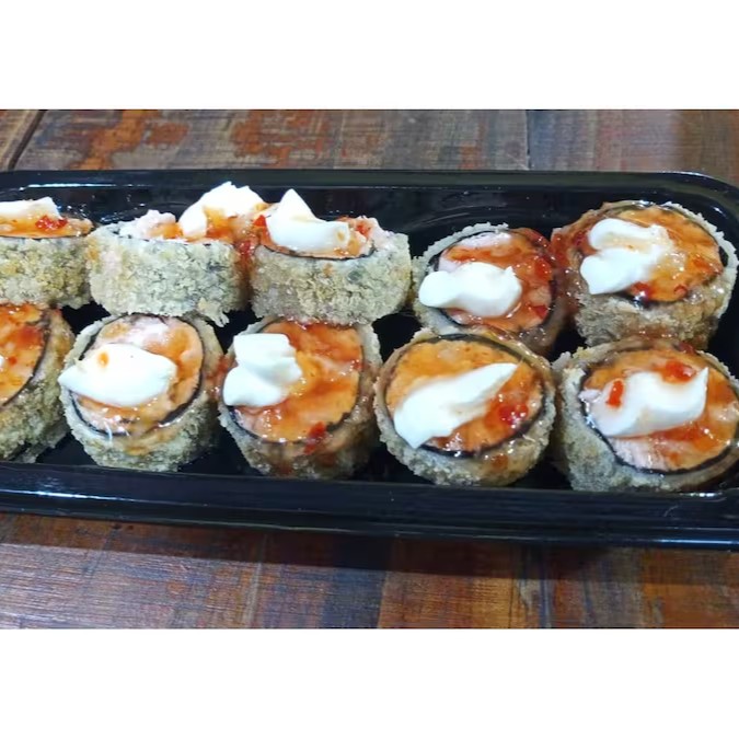 Sushi recheado com salmão, creme cheese, arroz, cebolinha empanado na farinha panko e frito.