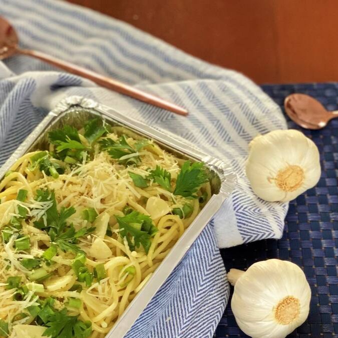Tradicional massa de fios Barilla mergulhada em azeite extra virgem e alho fatiado fino cozido lentamente, finalizado com salsinha, cebolinha frescas e queijo parmesão.