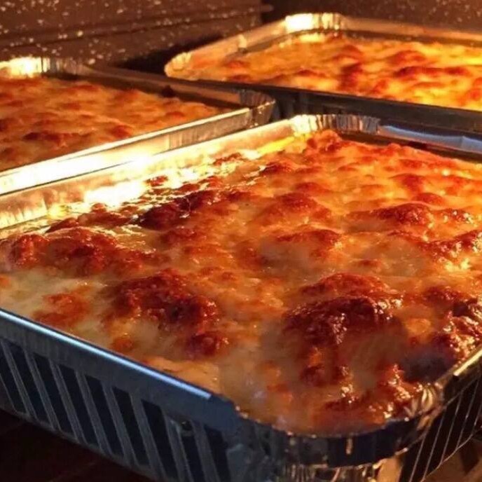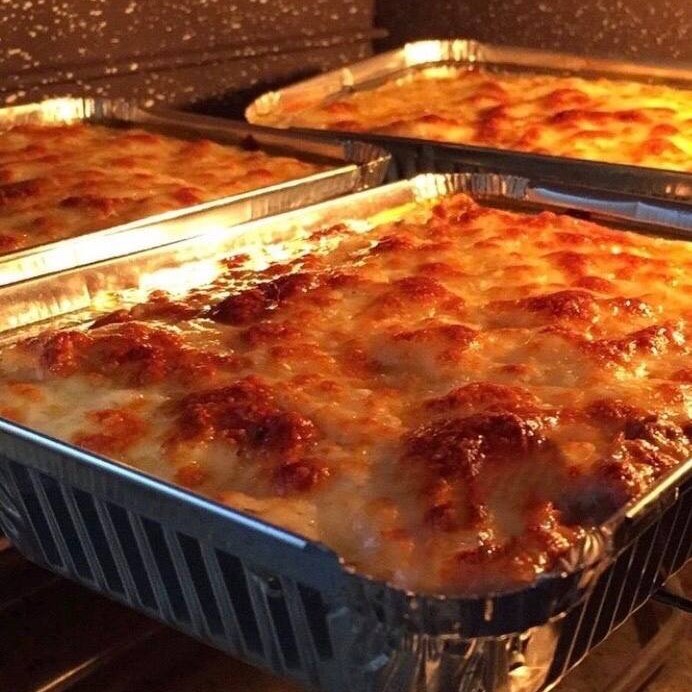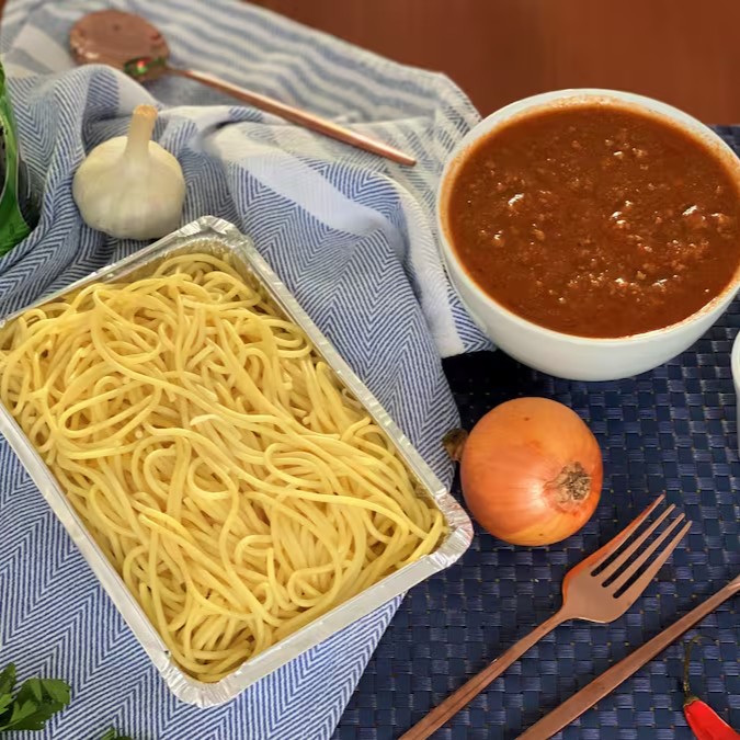 Massa de Spaghetti Barilla (300g), molho bolonhesa, molho branco cremoso (250g), finalizado com queijo mussarela gratinado.