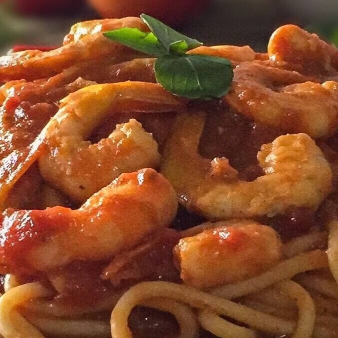 Massa de Spaghetti Barilla o n.º1 da Itália, com camarões grelhados em azeite extra virgem e molho pomodoro.