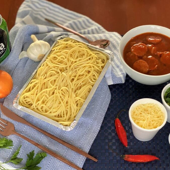Massa de Spaghetti Barilla (420g), finas fatias de linguiça calabresa douradas no azeite, com base de molho de tomates pelati, cebola meia lua e tempero especial da casa. (400g)