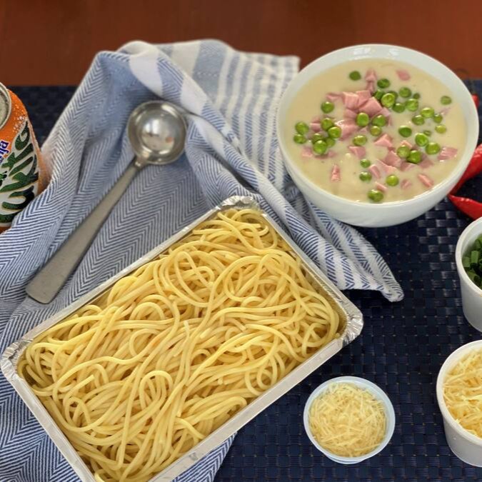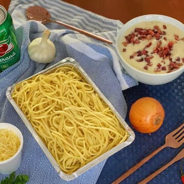 Massa de Spaghetti Barilla o n.º1 da Itália (420g), molho branco cremoso, com frango desfiado, bacon em cubinhos (400g). Acompanha mussarela e cebolinhas frescas.
