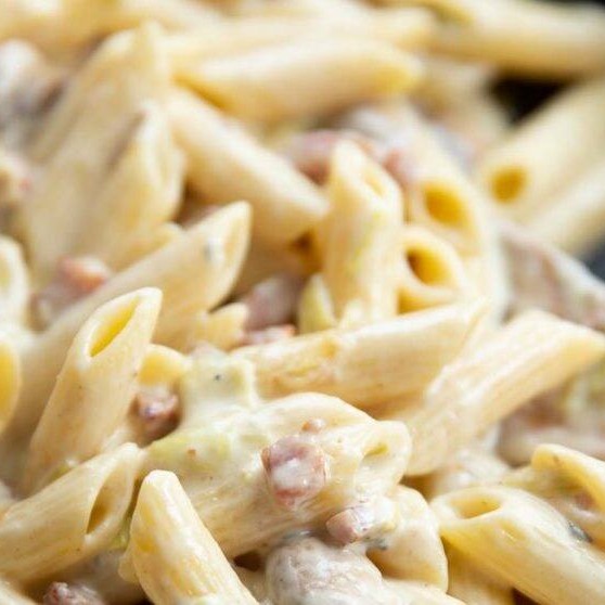 300g de massa penne, bacon em cubinhos, e molho gorgonzola.