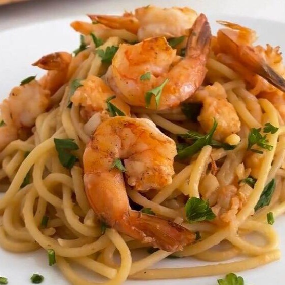 Massa de Spaghetti Barilla o n.º1 da Itália, camarões grelhados em azeite extra virgem, alho fatiado fino cozido lentamente, finalizado com salsinha, e cebolinha.