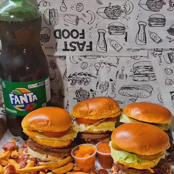 04 hambúrgueres Pop Plus, fritas, linguiça calabresa, 01 Refrigerante 2l / molhos