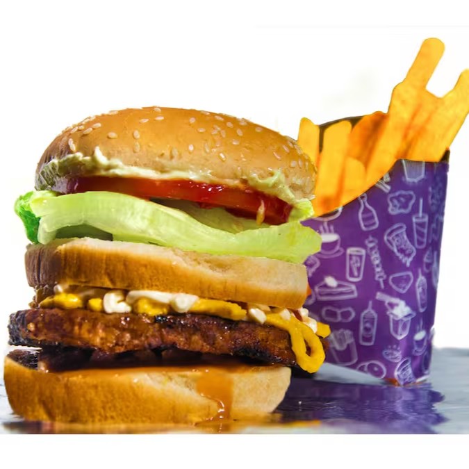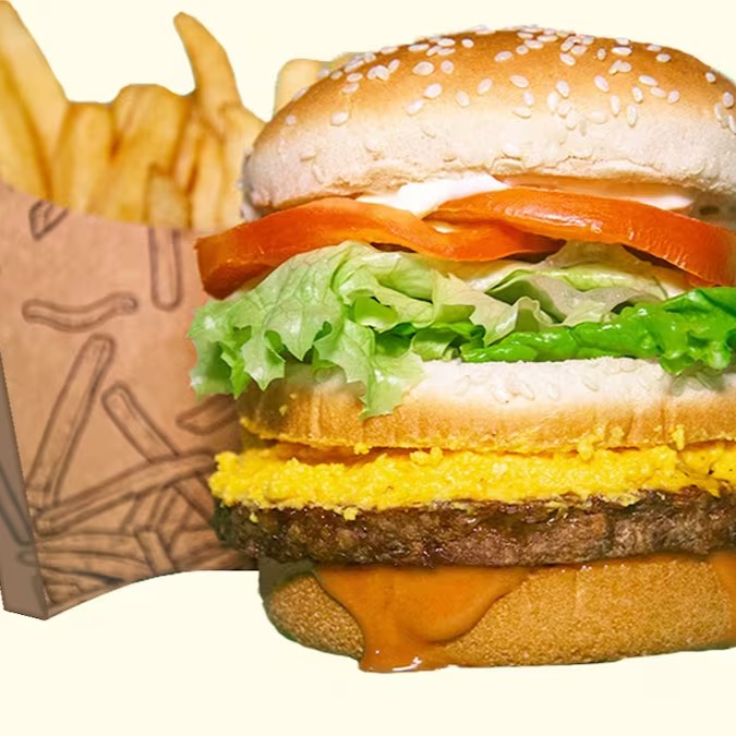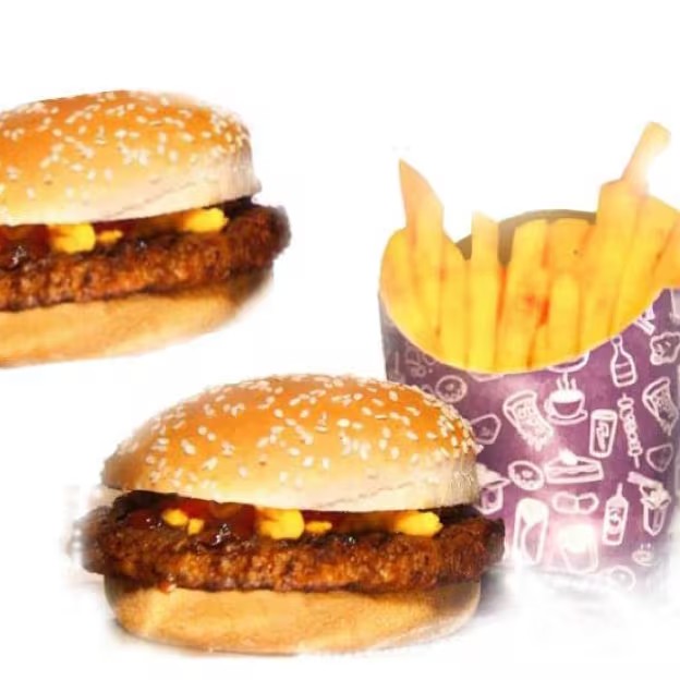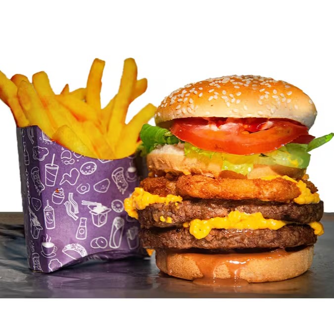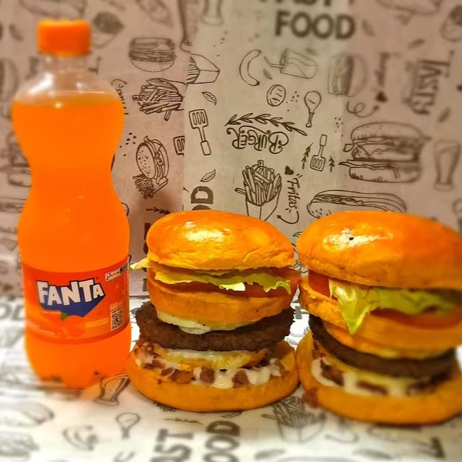 (2 Hambúrguer) Pão especial brioche Pita Bread, Molho Band, Hambúrguer de Picanha 120gr, Queijo Cheddar com uma poção de Batata Frita 150gr.