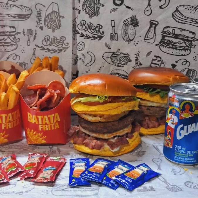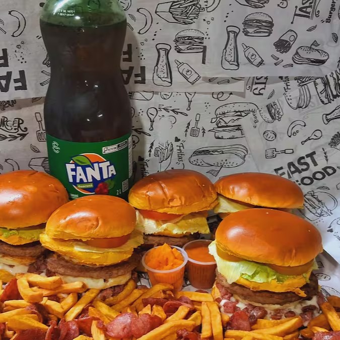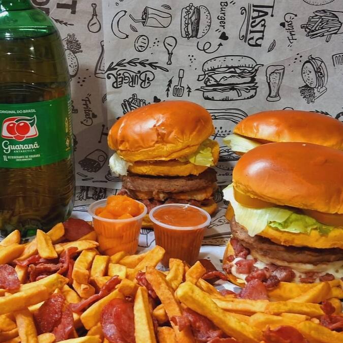 05 hambúrgueres Pop Plus, fritas, linguiça calabresa, 1 Refrigerante 2l, quatro molhos.