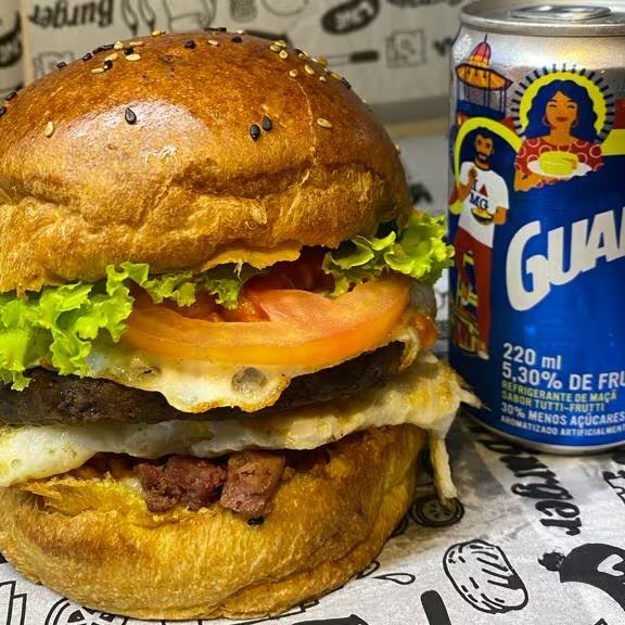 Pão Brioche, Molho Band, Duplo Hambúrguer de Picanha 120g, Bacon , Duplo Cheddar , Cebola Crispy e Batata frita 150gr + Guarapan 220ml