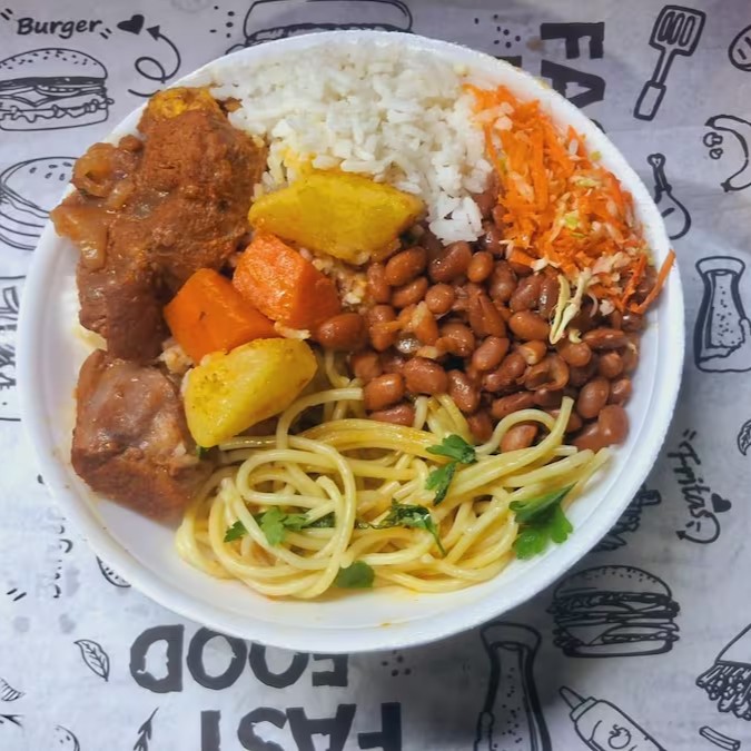 Arroz, Feijão, macarrão, carne cozida com legumes, salada (tempero caseiro)