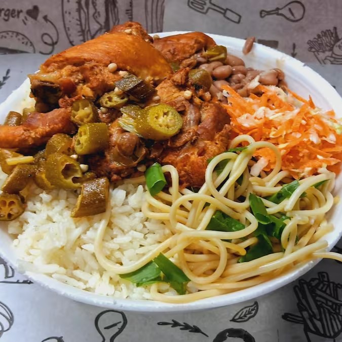 Arroz, Feijão, Macarrão ao alho, frango com Quiabo e salada